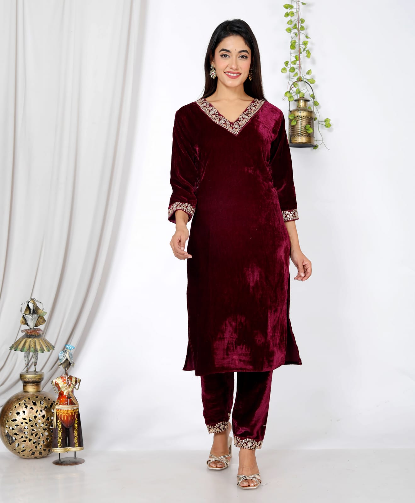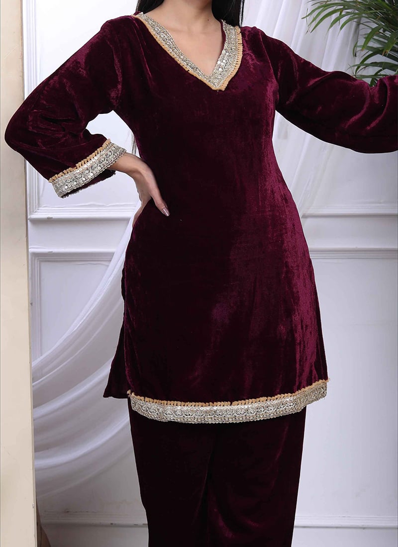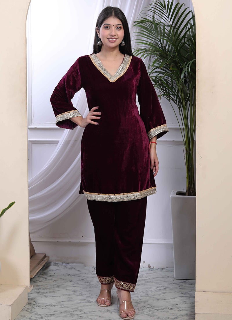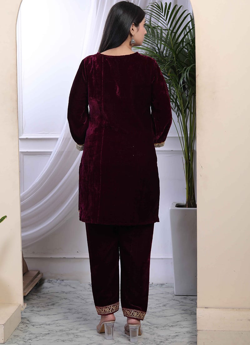 Wine Velvet Embroidered Indowestern Co ord Set Festive Wear